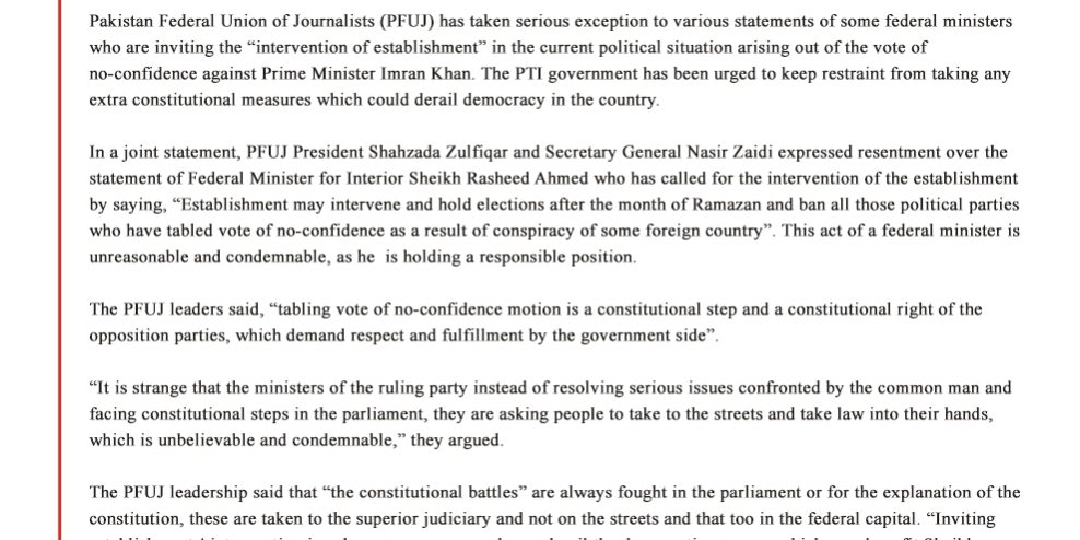 Pakistan Federal Union of Journalists (PFUJ) has taken serious exception to various statements of some federal ministers who are inviting the “intervention of establishment” in the current political situation arising out of the vote of no-confidence against Prime Minister Imran Khan. The PTI government has been urged to keep restraint from taking any extra constitutional measures which could derail democracy in the country.